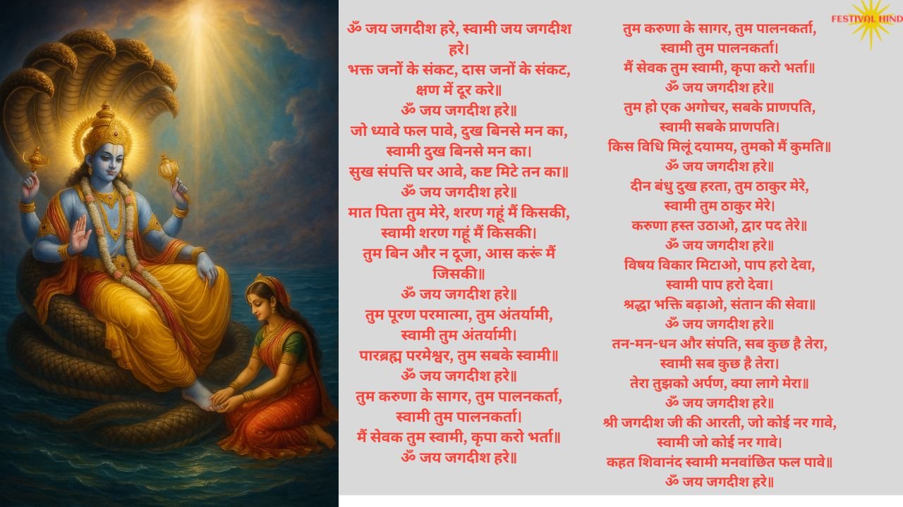 भगवान विष्णु की आरती “ॐ जय जगदीश हरे” एक अत्यंत लोकप्रिय भक्ति गीत है, जिसे घर-घर और मंदिरों में गाया जाता है। इस आरती में भगवान विष्णु की महिमा का वर्णन किया गया है और उनसे आशीर्वाद मांगा जाता है।
